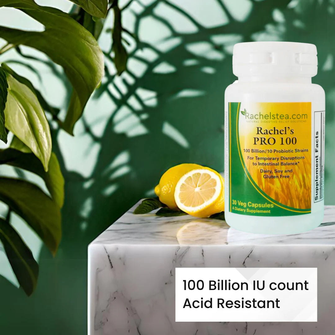 Rachel’s Pro 100 probiotic has 100 BILLION count of bacteria. One of the highest on the market and the only one we know of that contains only acid resistant strains to help it survive stomach acid and thrive where you need it. It’s made fresh just for us to ensure potency on delivery and it’s shelf stable so there’s no need for refrigeration.